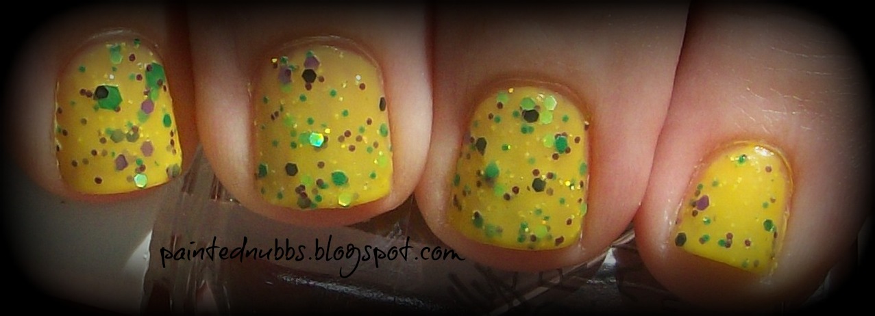 And lastly, we have my favorite of the bunch: Drunken Zombie. This is another one of those weird colors that I love! It has black, purple and green matte glitter, as well as gold and pruple holo glitter in a yellow-greenish base. It has been compared to a booger colored base lol.